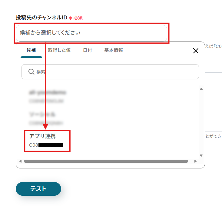入力欄をクリックすると、連携しているSlackアカウントから候補が表示されるため、対象となるチャンネルを選択してください。