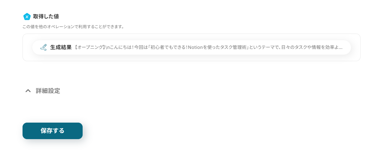 - 期待通りの生成結果であれば、ページ下部の「保存する」をクリック。