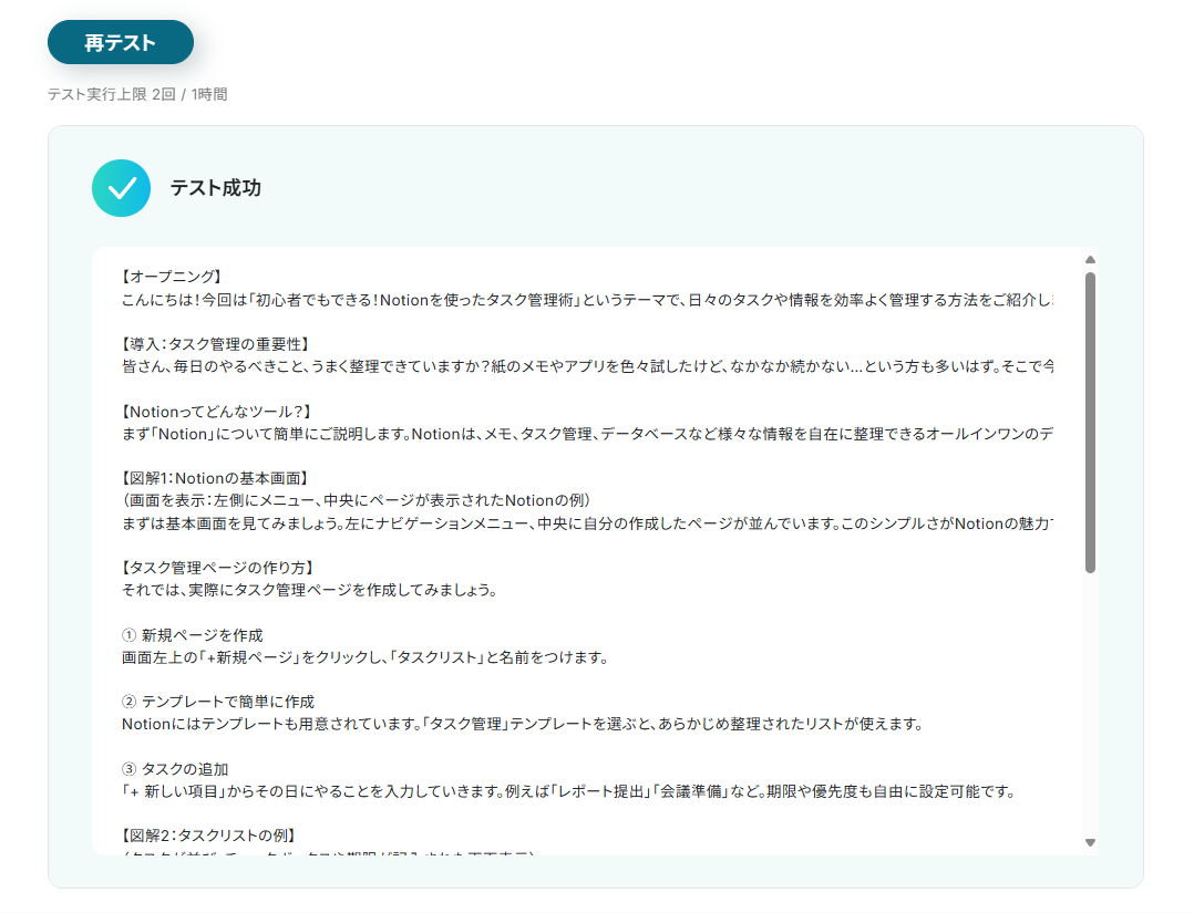 - テストに成功すると、「取得した値」に生成結果が追加されます。