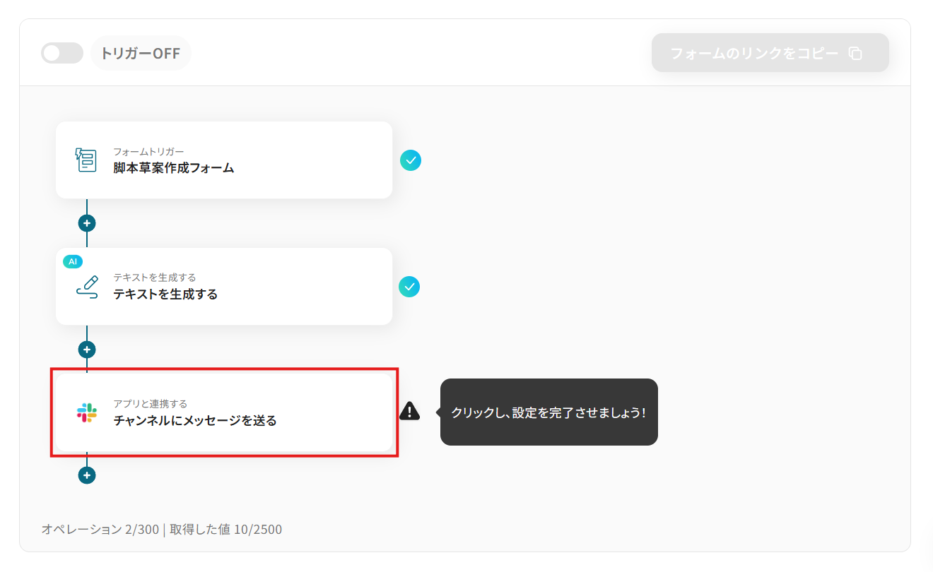 オンラインフォームに入力されたテーマやプロット、キャラクター設定などの情報をもとに、AIが脚本の草案を自動で生成し、指定したコミュニケーションツール(例:Slack)に通知するフローです。