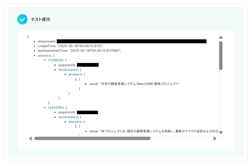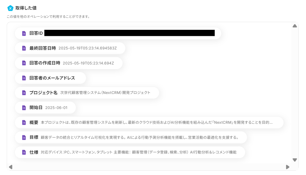 ・Googleフォームをトリガーとして使用した際の回答内容を取得する方法は下記を参照ください。