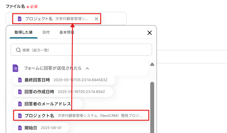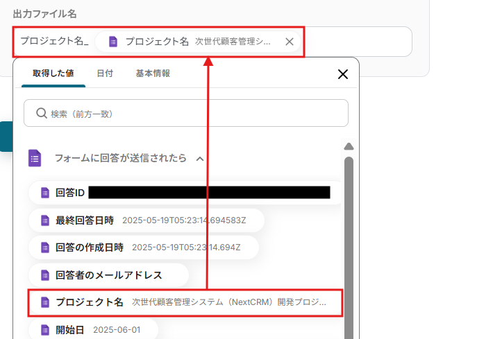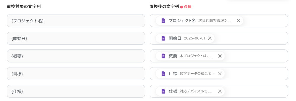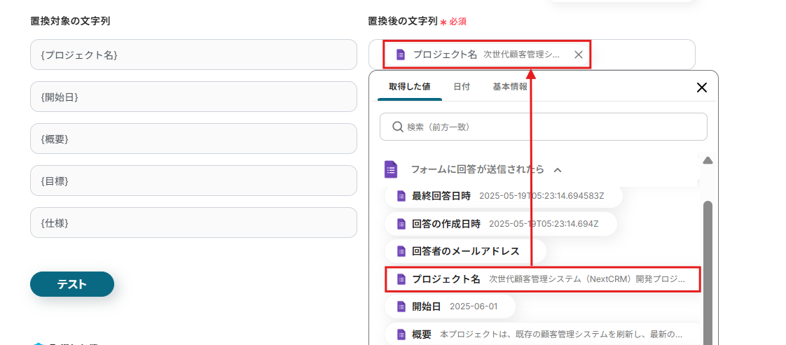 右の置換後の文字列に取得した値から「プロジェクト名」を入力します。