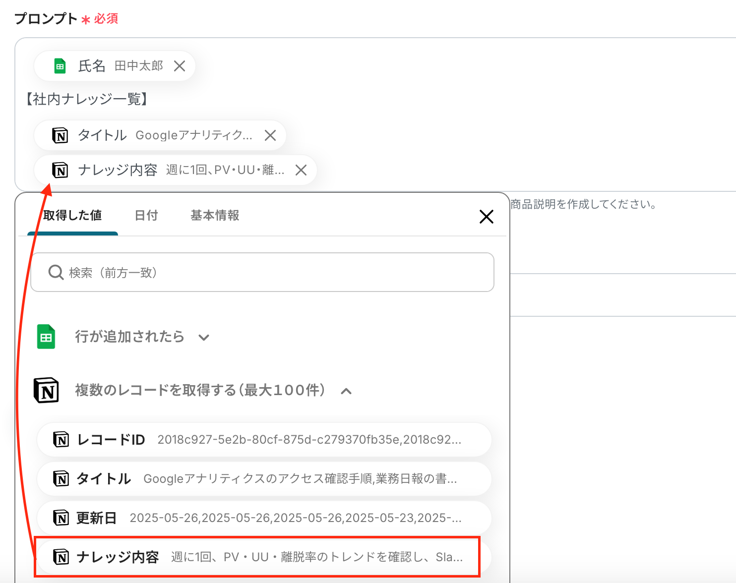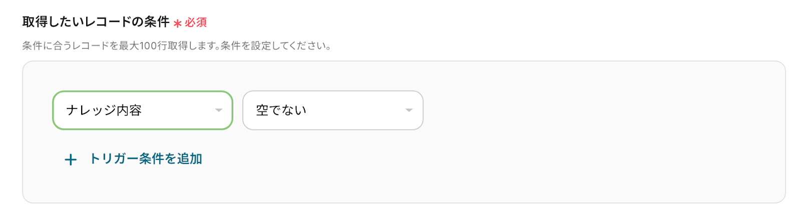 今回は、「ナレッジ内容 空でない」と設定し、複数のレコードを取得します。