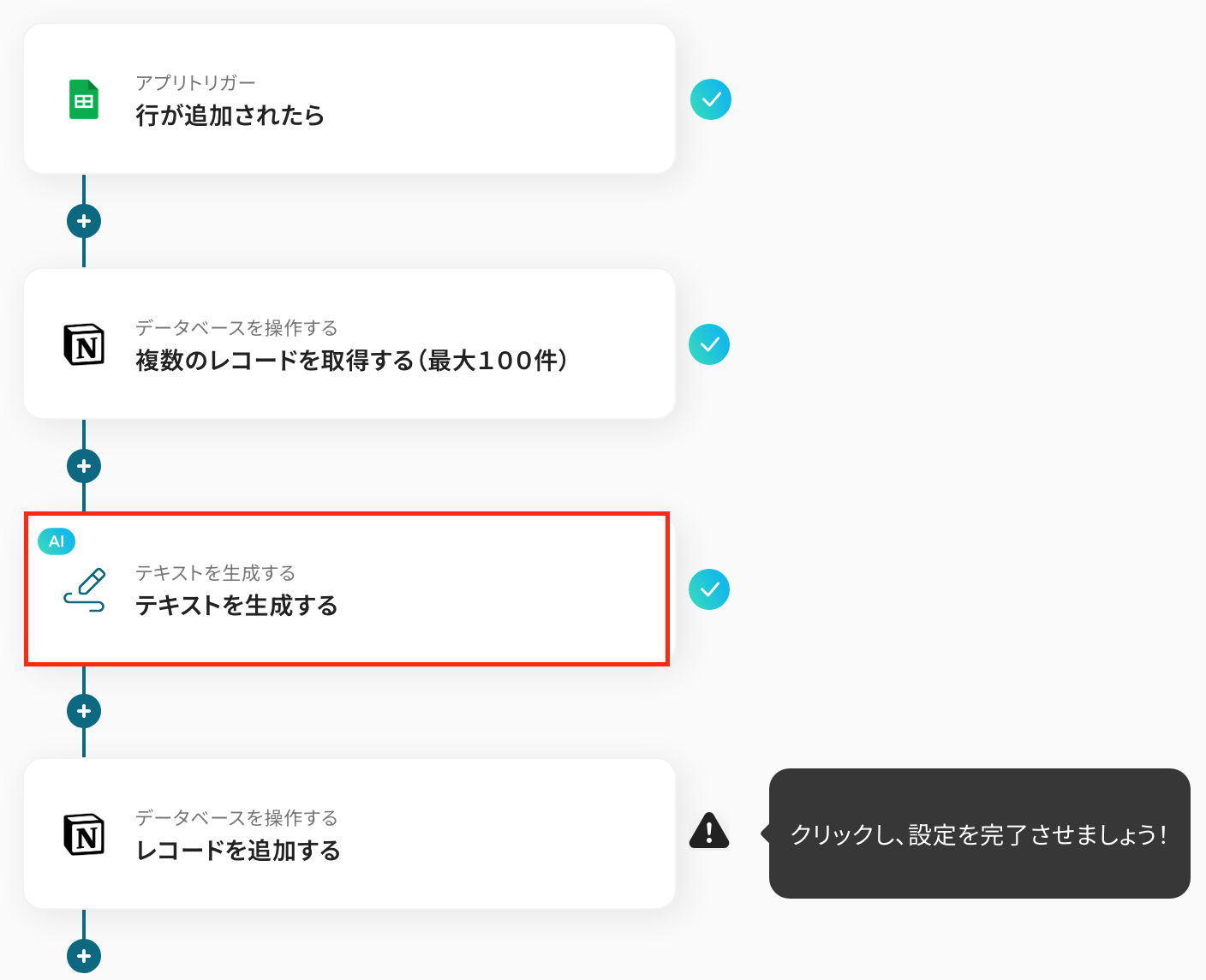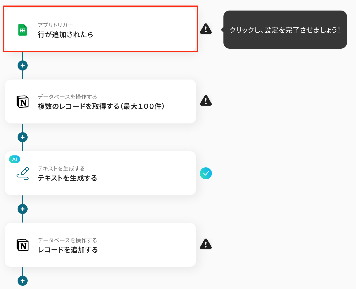 - Google スプレッドシートのトリガー設定とテキスト生成の設定、Notionのアクション設定