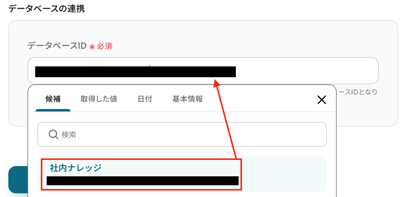 「データベースID」とは、入力欄をクリックして表示される候補から選択してください。