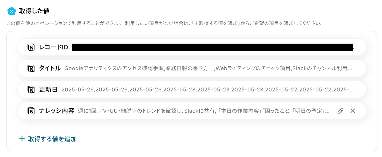 ここでは、Notionで管理されている社内ナレッジのデータを取得する設定を行います。