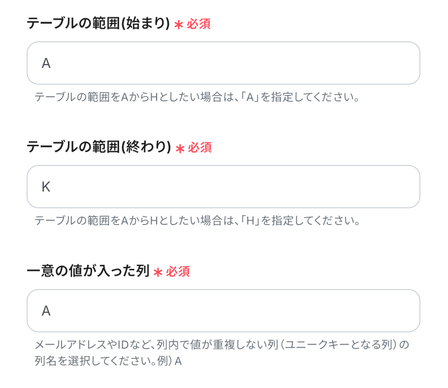 一意の値が入った列:列内で値が重複しない列の列名を選択。今回は氏名の列のA。