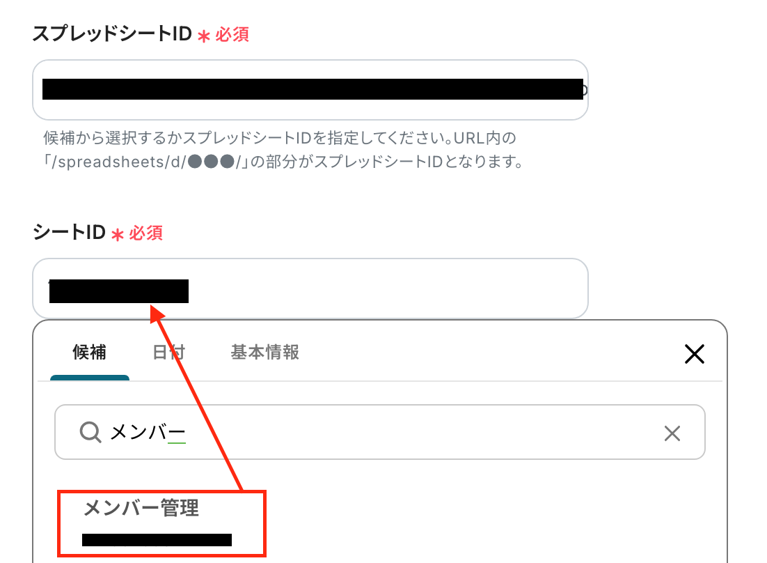 スプレッドシートIDとシートIDは、入力欄をクリックして表示される「候補」から選択してください。