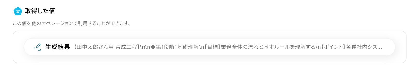 新メンバーのスキルや経験に関する情報を収集するフォームが送信されたら、その回答内容と社内ナレッジ(例えばExcelファイルに蓄積されたデータ)を基にAIがパーソナライズされた育成プランを生成し、結果を表計算ソフトの指定のシートに自動で追記できます。