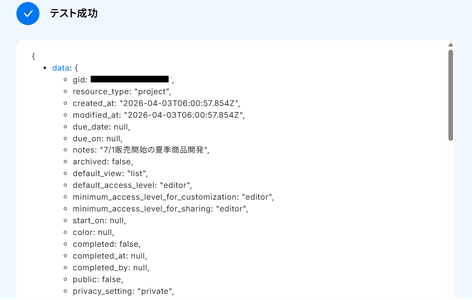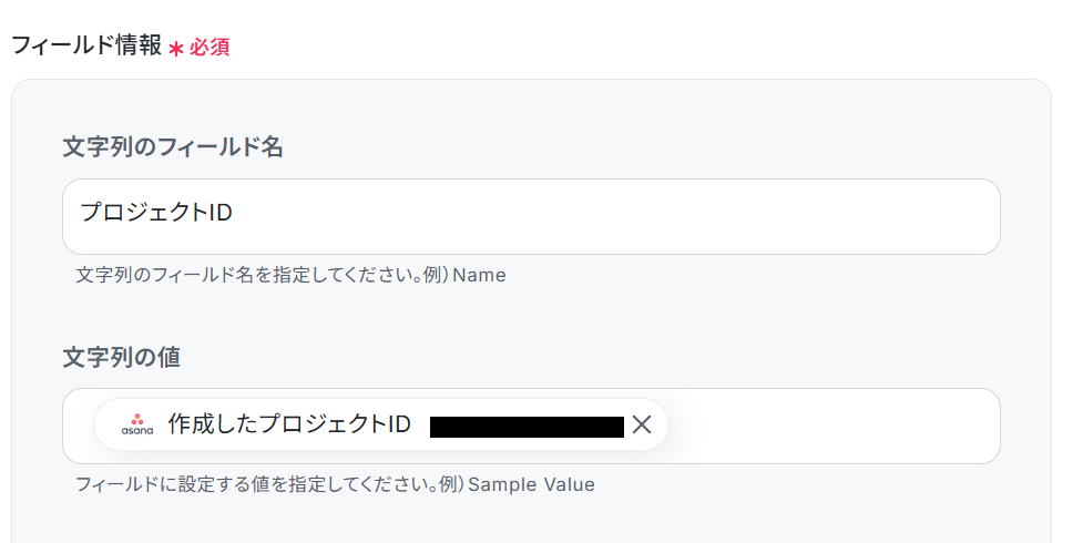 文字列の値は、Asanaで作成したプロジェクトを設定しましょう。