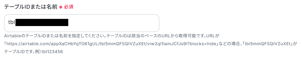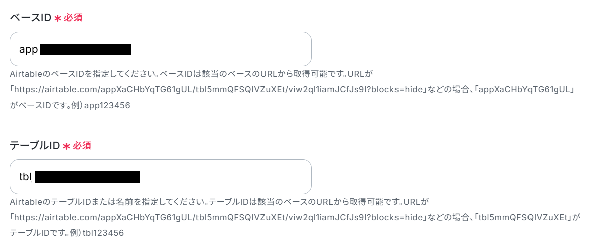 ベースIDおよびテーブルIDは、各入力欄の注釈をご確認のうえ、AirtableのURLから該当する情報を取得し、設定してください。