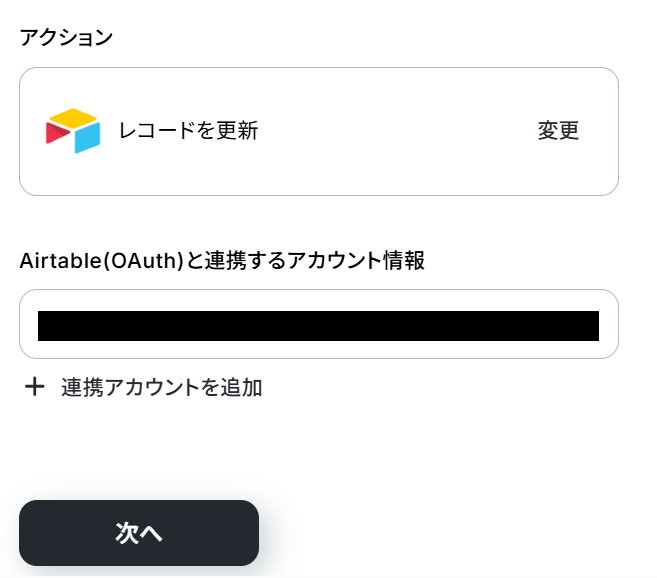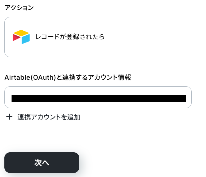 Airtable(OAuth)と連携するアカウント情報は、ステップ3で設定したアカウント情報と同一になっていることを確認してください。