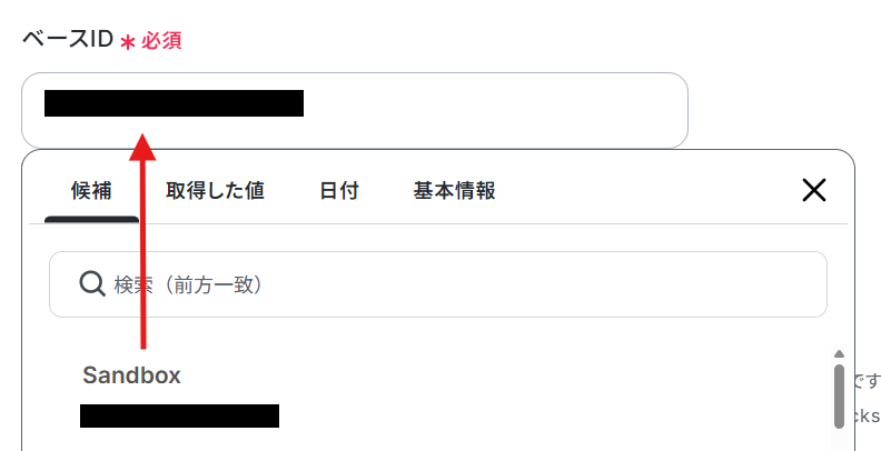 ベースIDは、枠内をクリックし表示される候補から選択してください。