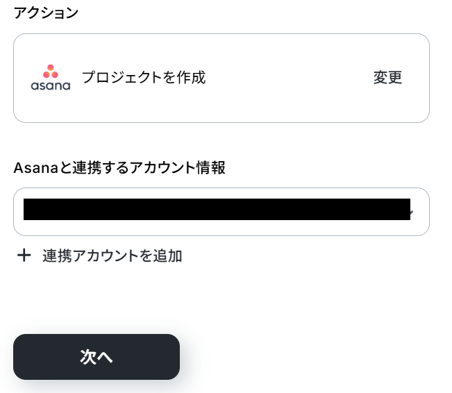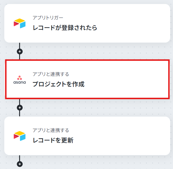 続いて、Airtableに登録したレコードの情報を引用し、Asanaのプロジェクトを自動で作成する設定をおこないます。