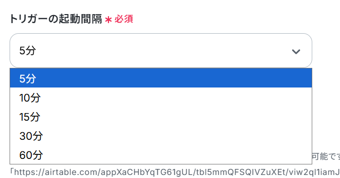 トリガーの起動タイミングは、5分・10分・15分・30分・60分の中から選択して設定できます。