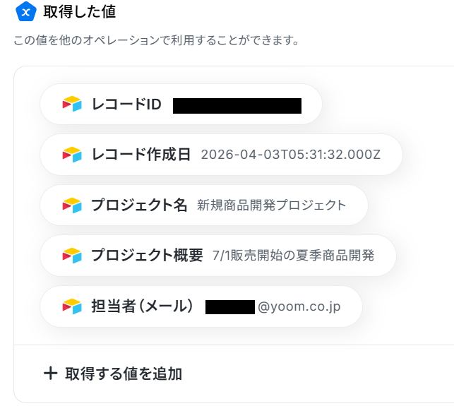 ここで取得した値は、この後設定するステップで活用することが可能です。