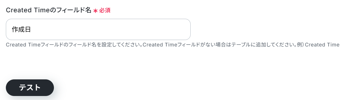 Created Timeのフィールド名は、あらかじめ準備しておいたテーブルから、「Created Time」に該当するフィールド名を入力してください。入力できたら「テスト」ボタンをクリックしましょう。