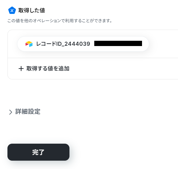問題無く取得した値にレコードIDが表示されたら、「完了」ボタンをクリックしましょう。