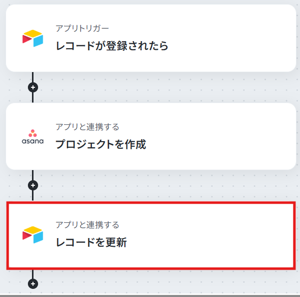 最後に、ステップ4で作成したAsanaのプロジェクトIDをAirtableのレコードに更新するための設定をおこないます。