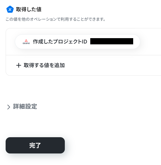 テストが成功し、取得した値に「作成したプロジェクトID」が表示されたら、「完了」ボタンをクリックしましょう。