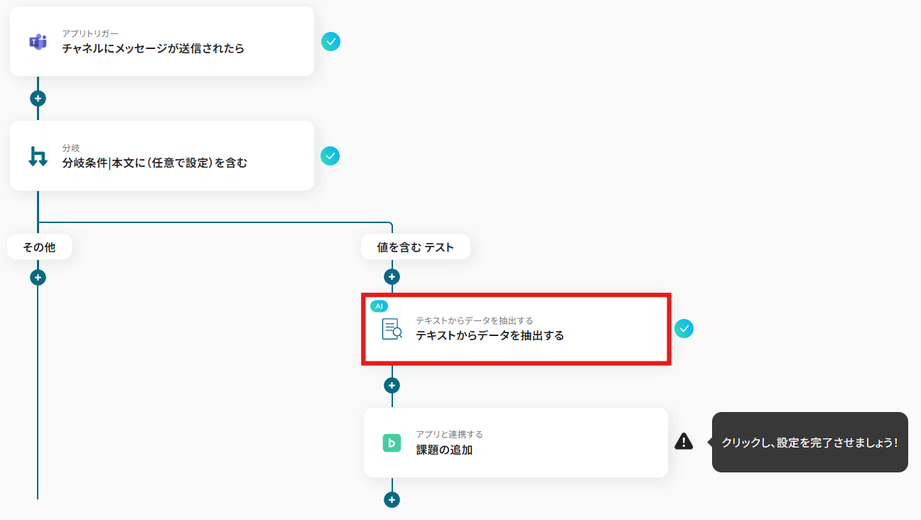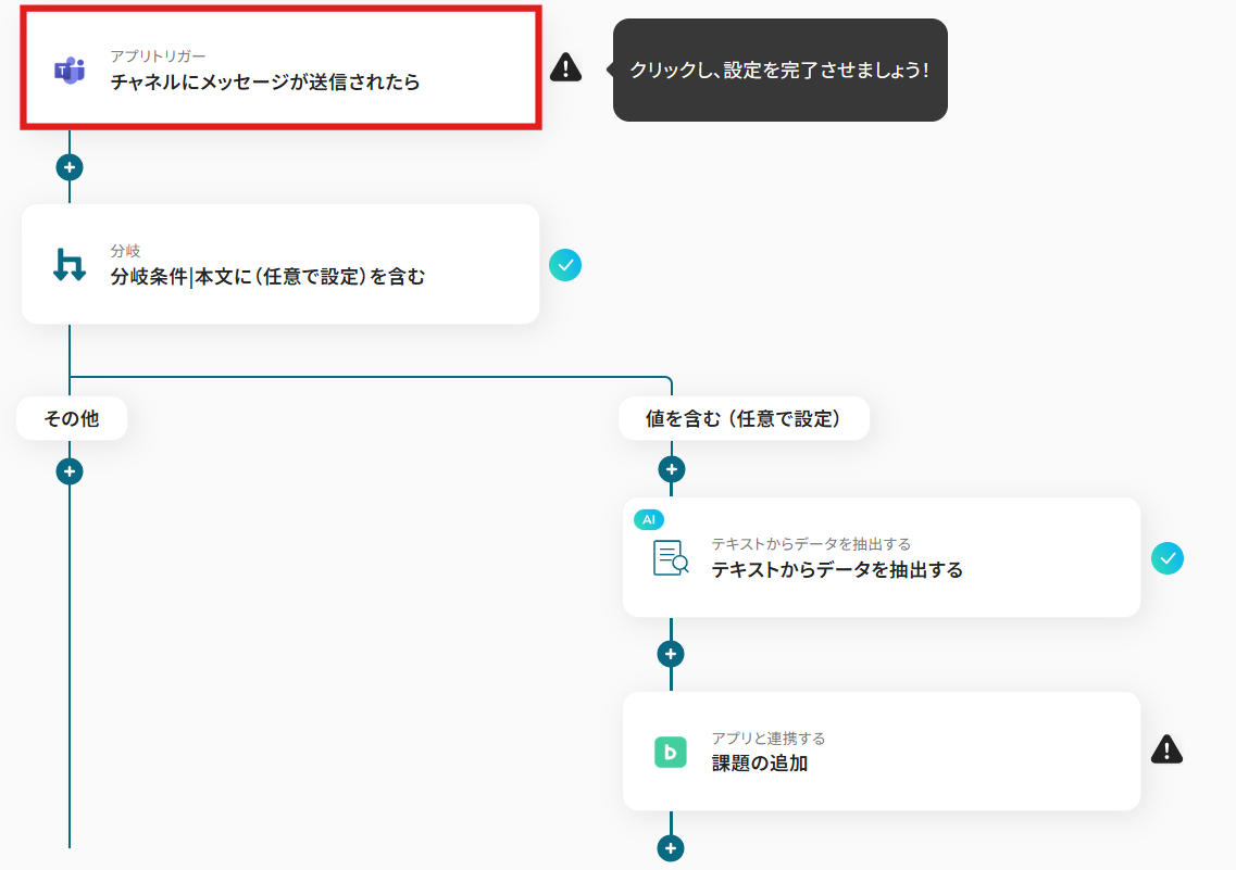 Microsoft Teamsのトリガー設定、AIによるデータ抽出設定、Backlogのアクション設定