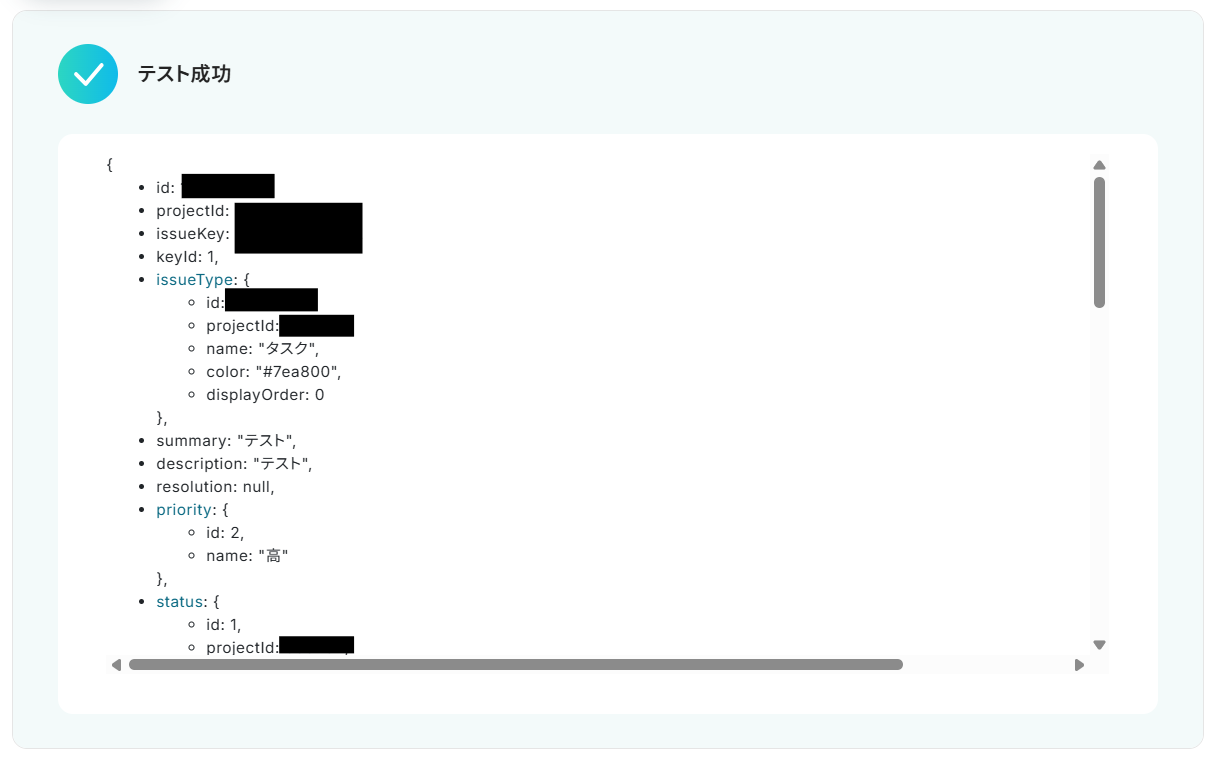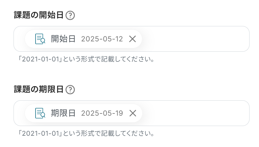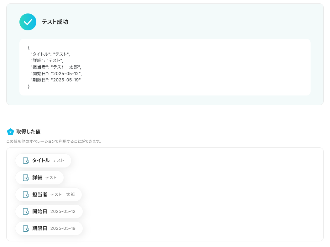 「課題の開始日」と「課題の期限日」も先ほどと同様に、「テキストからデータを抽出する」のアウトプットから選択してください。 設定が完了したら、「テスト」をクリックします。