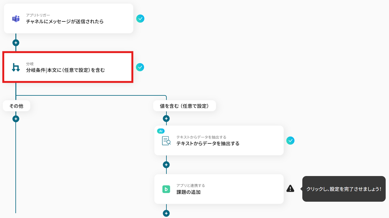 続いて、特定のキーワードの有無により分岐する設定を行うため、以下の赤枠をクリックします。