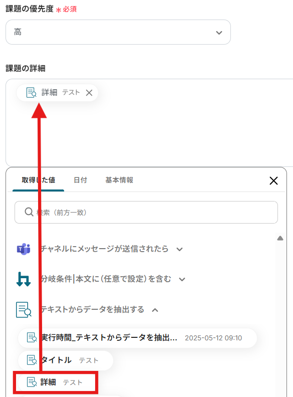 「課題の優先度」と「課題の詳細」を設定しましょう。 「課題の詳細」は「テキストからデータを抽出する」のアウトプットを活用して設定してください。
