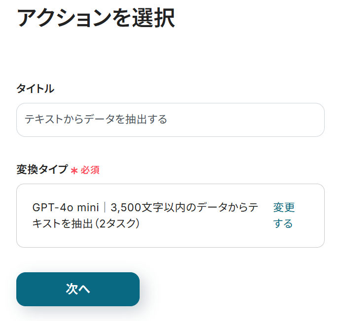 スクロールし、「課題の件名」を設定してください。 「テキストからデータを抽出する」のアウトプットから「タイトル」を選択しましょう。