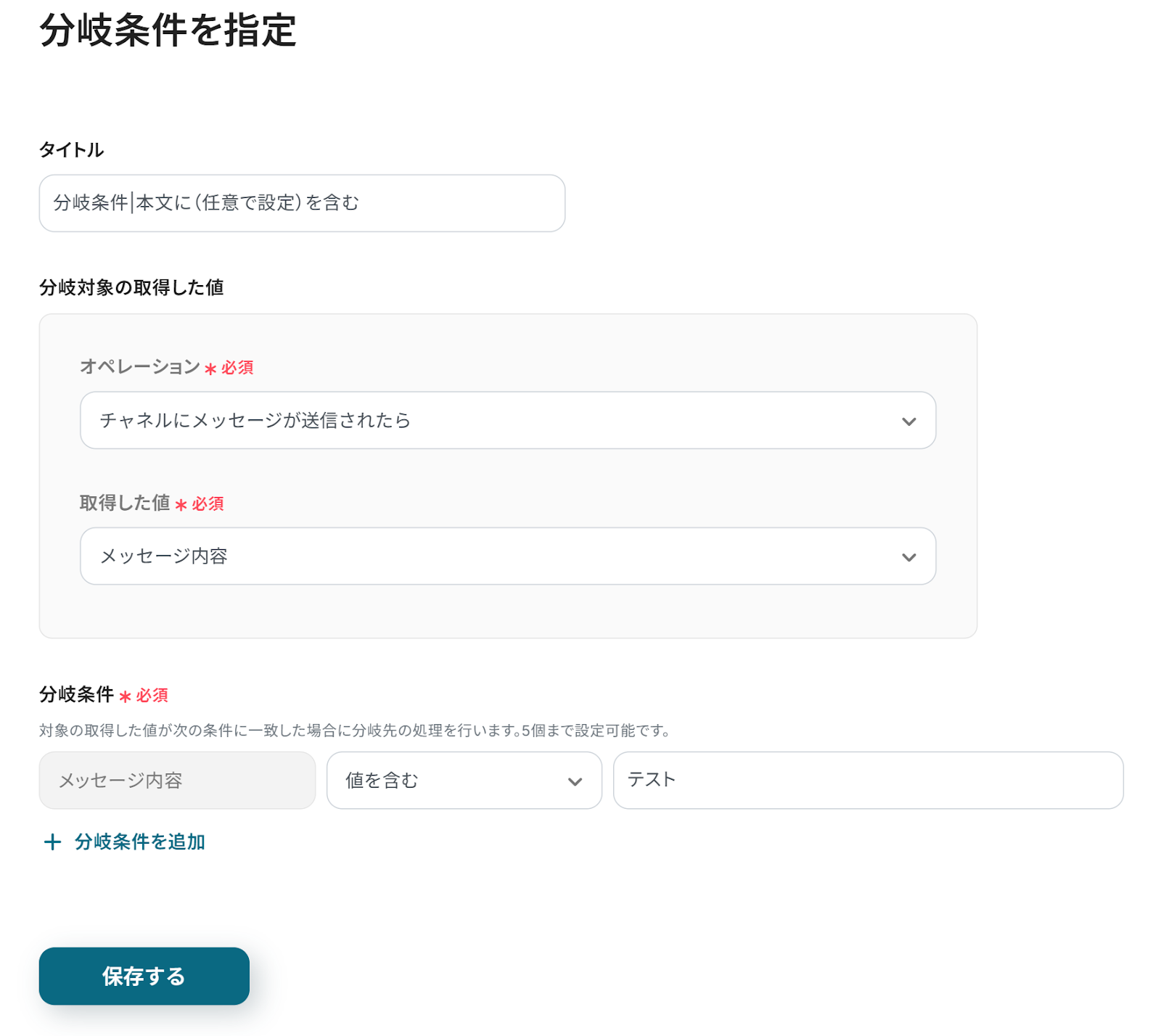 以下の画面が表示されるので、設定を行います。「分岐対象の取得した値」はそのままにし、「分岐条件」を設定してください。今回はメッセージ内容に「テスト」というキーワードが含まれる場合にBacklogに課題を追加する設定にします。
