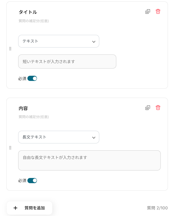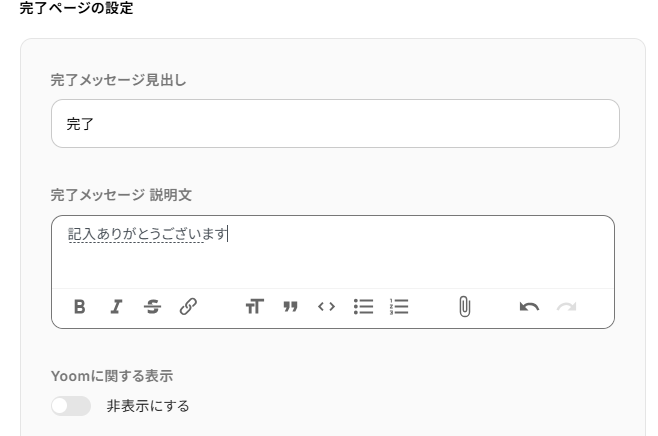 「完了ページの設定」は、フォーム回答が完了したときに出る文言の設定なので、任意で追加してください。