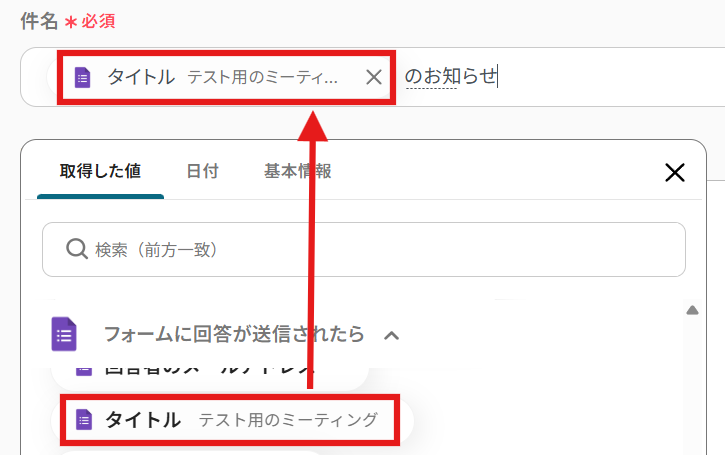こちらも、Googleフォームの回答から取得した値を使用しましょう。
