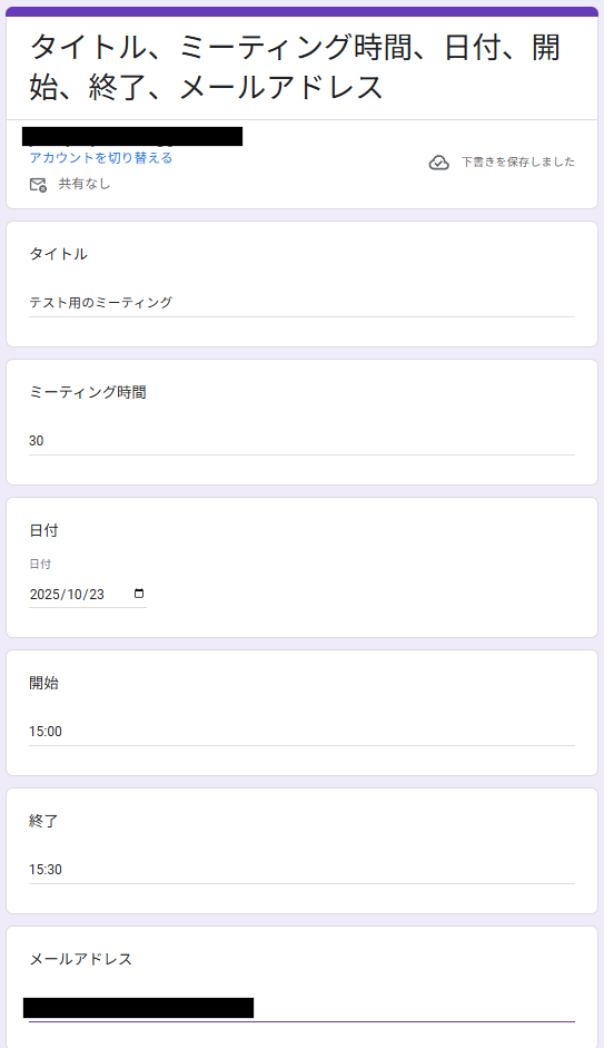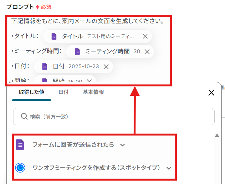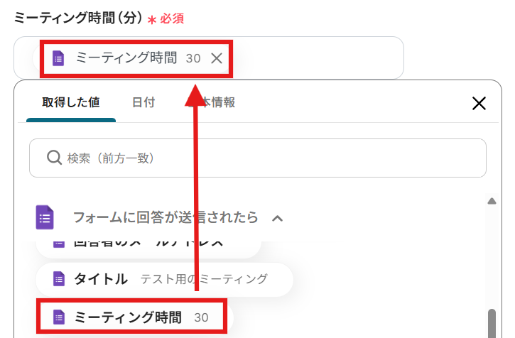 ミーティング時間もGoogleフォームのトリガー設定の際に取得した値の中から選びます。