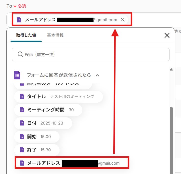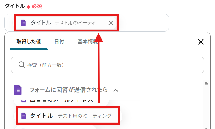 入力欄をクリックすると選択肢が表示されますので、取得した値の中から選びましょう。