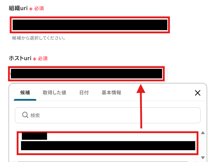 組織urlとホストurlはそれぞれ入力欄をクリックすると表示される候補の中から選択してください。
