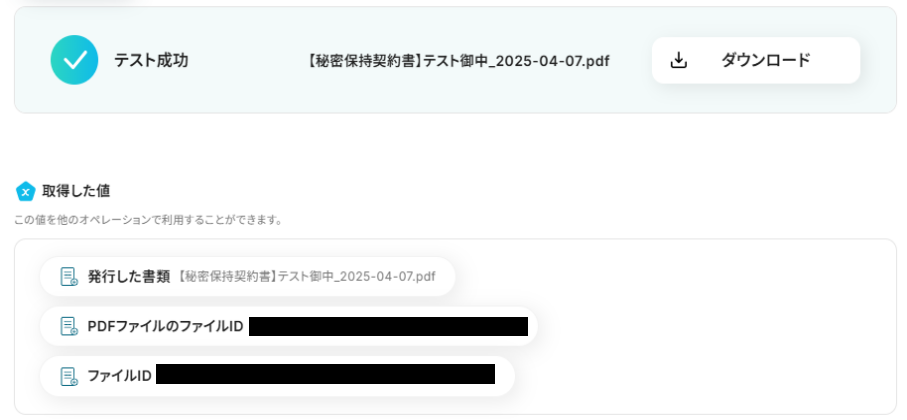 テストが成功すると、自動作成された契約書のダウンロードボタンとアウトプットが表示されます。