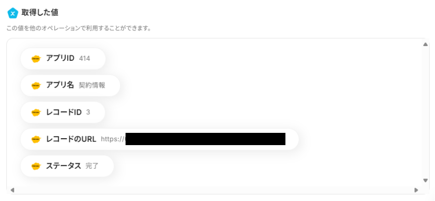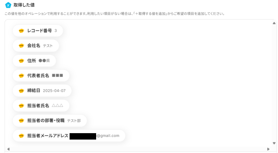 アウトプットとは、トリガーやオペレーション設定時に、「テスト」を実行して取得した値のことを指します。