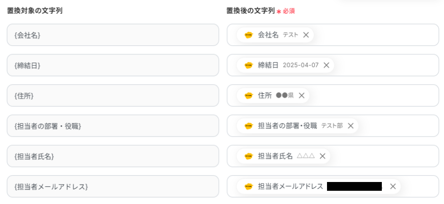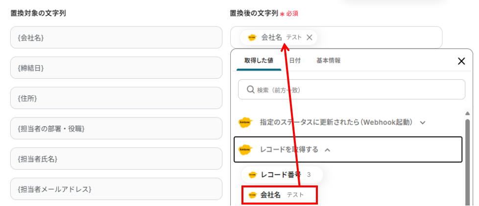 次に、Googleドキュメントで作成した契約書の雛形のうち、「置換対象」の値をkintoneのデータに置き換える設定です。