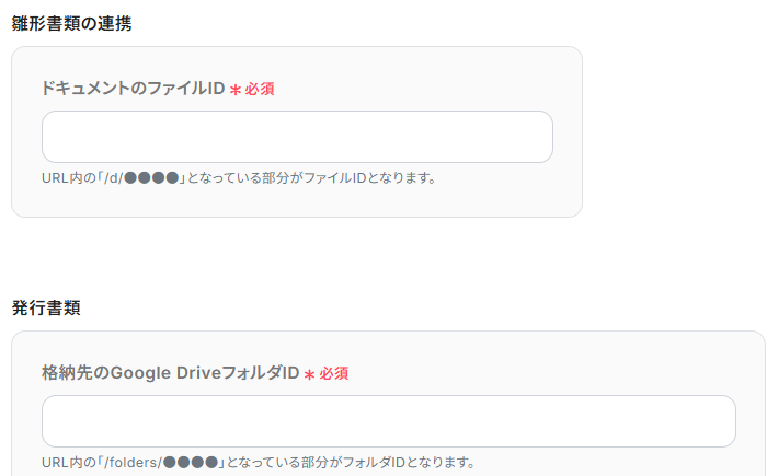 ドキュメントの「ファイルID」と、書類格納先であるGoogle Driveの「フォルダID」は、入力欄下の注釈を参考に入力しましょう。