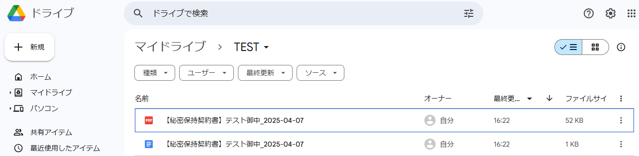 Google Driveに、指定したファイル名でGoogleドキュメントファイルとPDFファイルが格納されていることも確認してみてくださいね!