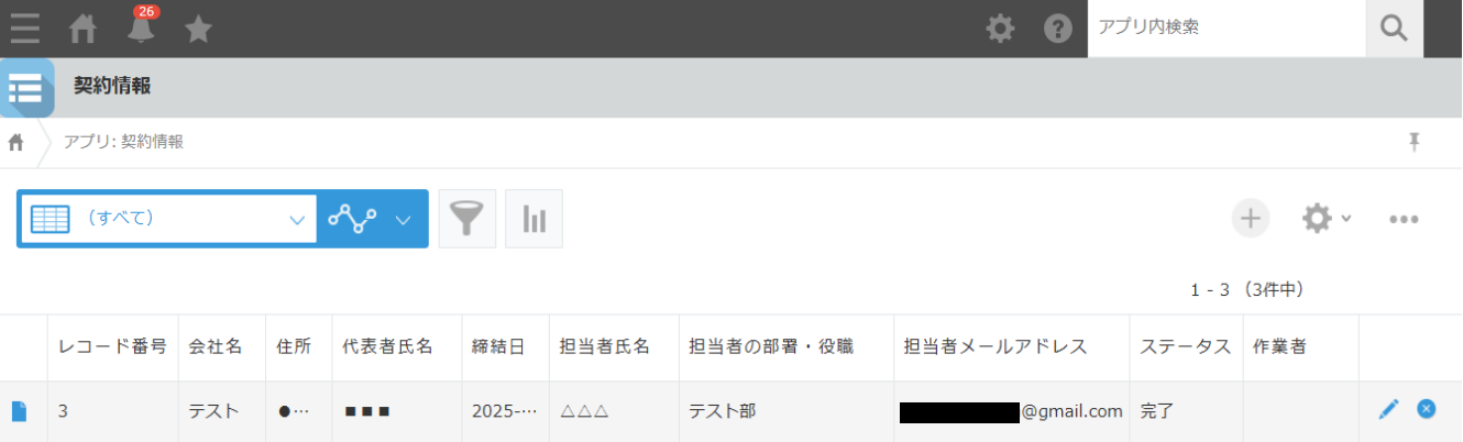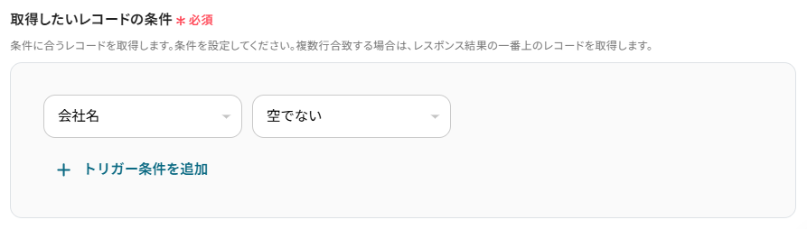 「会社名」や「担当者名」など、必ず値が入る項目が「空でない」と条件を指定することで、レコードの情報を全て取得できるようになります。