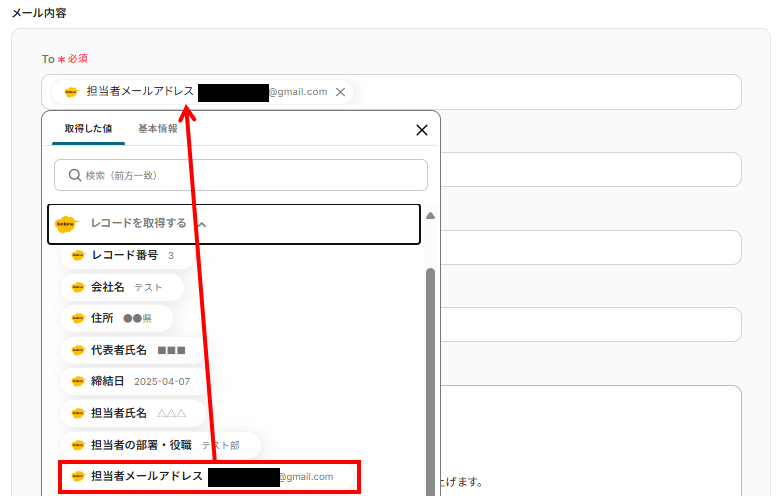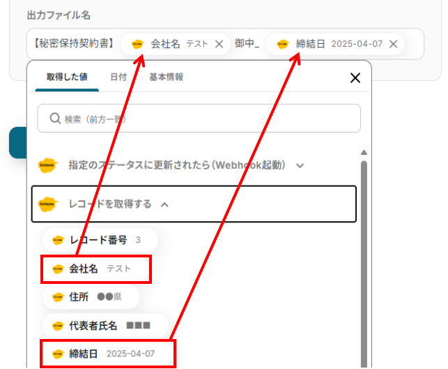 入力欄をクリックするとアウトプットが表示されるので、各項目について、それぞれ該当するkintoneのデータを選択しましょう。