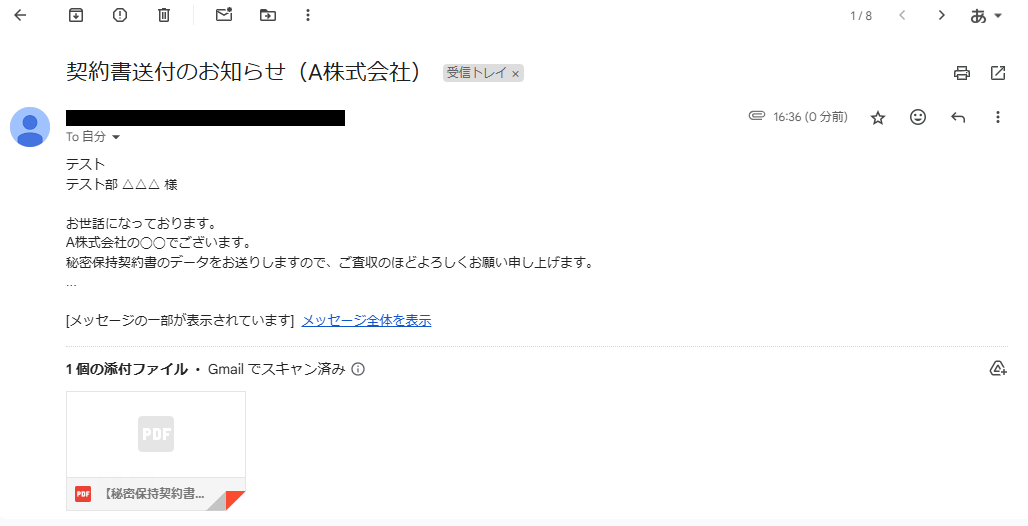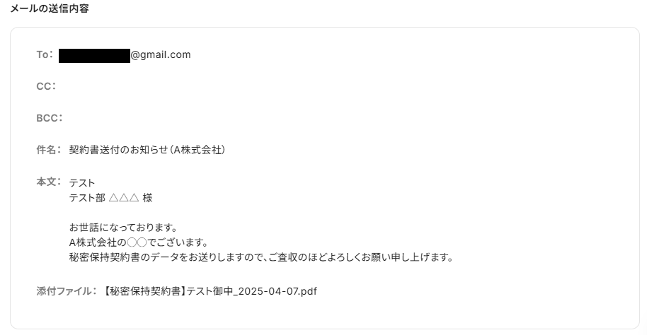 自動作成された契約書が添付された状態で、正しくメールが届いていることを確認しましょう。