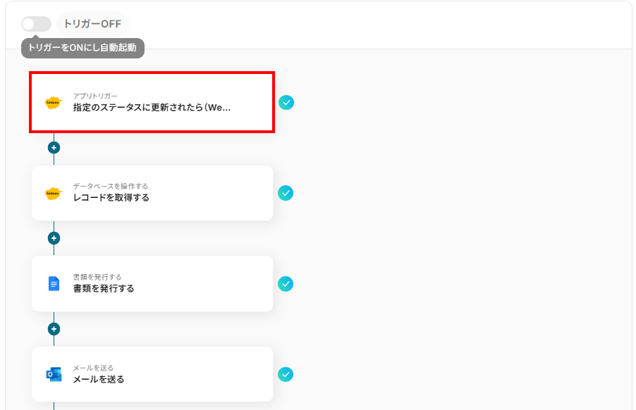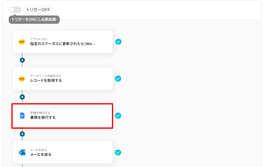 kintoneで特定のステータスに更新された際に、自動的に契約書を作成し、関係者にメールで送信するフローです。