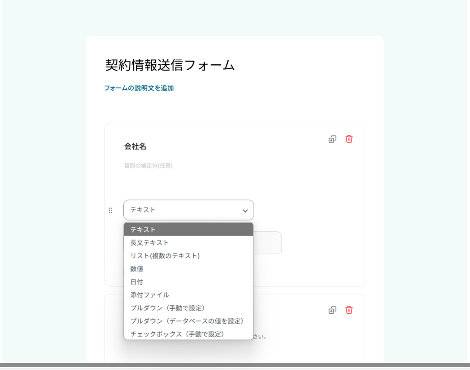 (2)「フォーム作成」画面から、質問内容と回答方法をプルダウンから選択します。