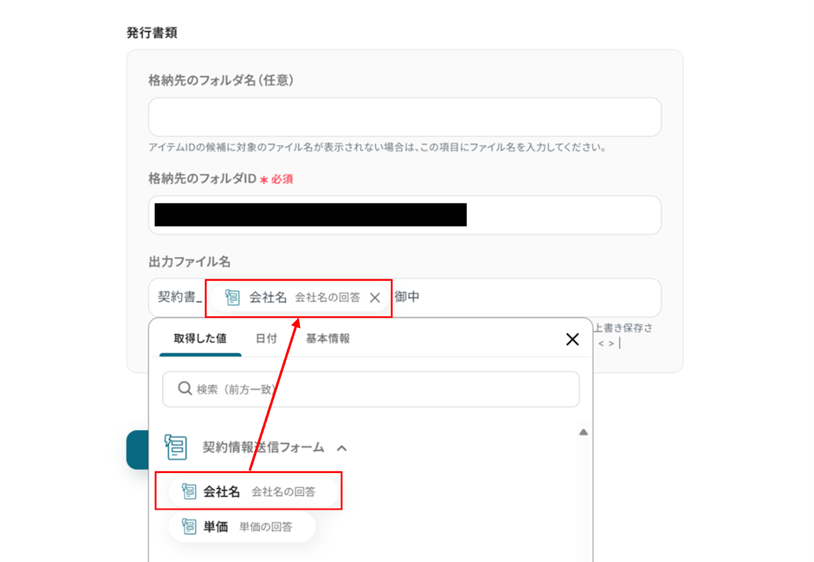 発行書類では、作成した契約書の格納先やファイル名を設定します。