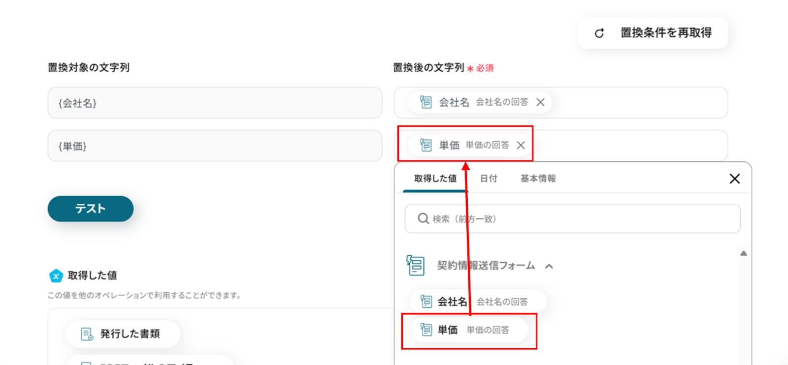 (3)「置換条件の設定」画面から置換後の文字列に「取得した値」を使って入力します。