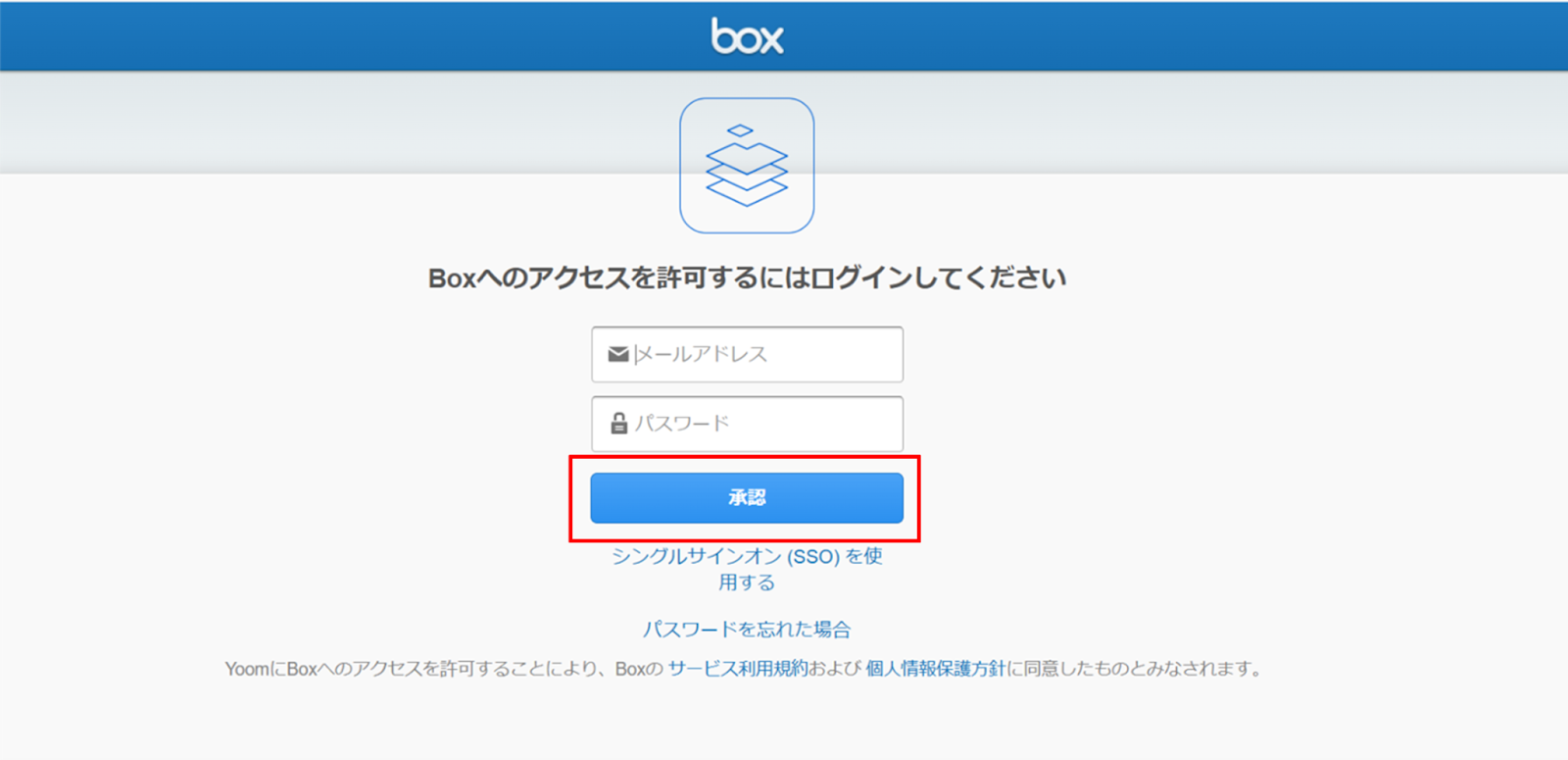 Boxへのアクセス画面から、メールアドレス、パスワードを入力し、承認をクリックします。