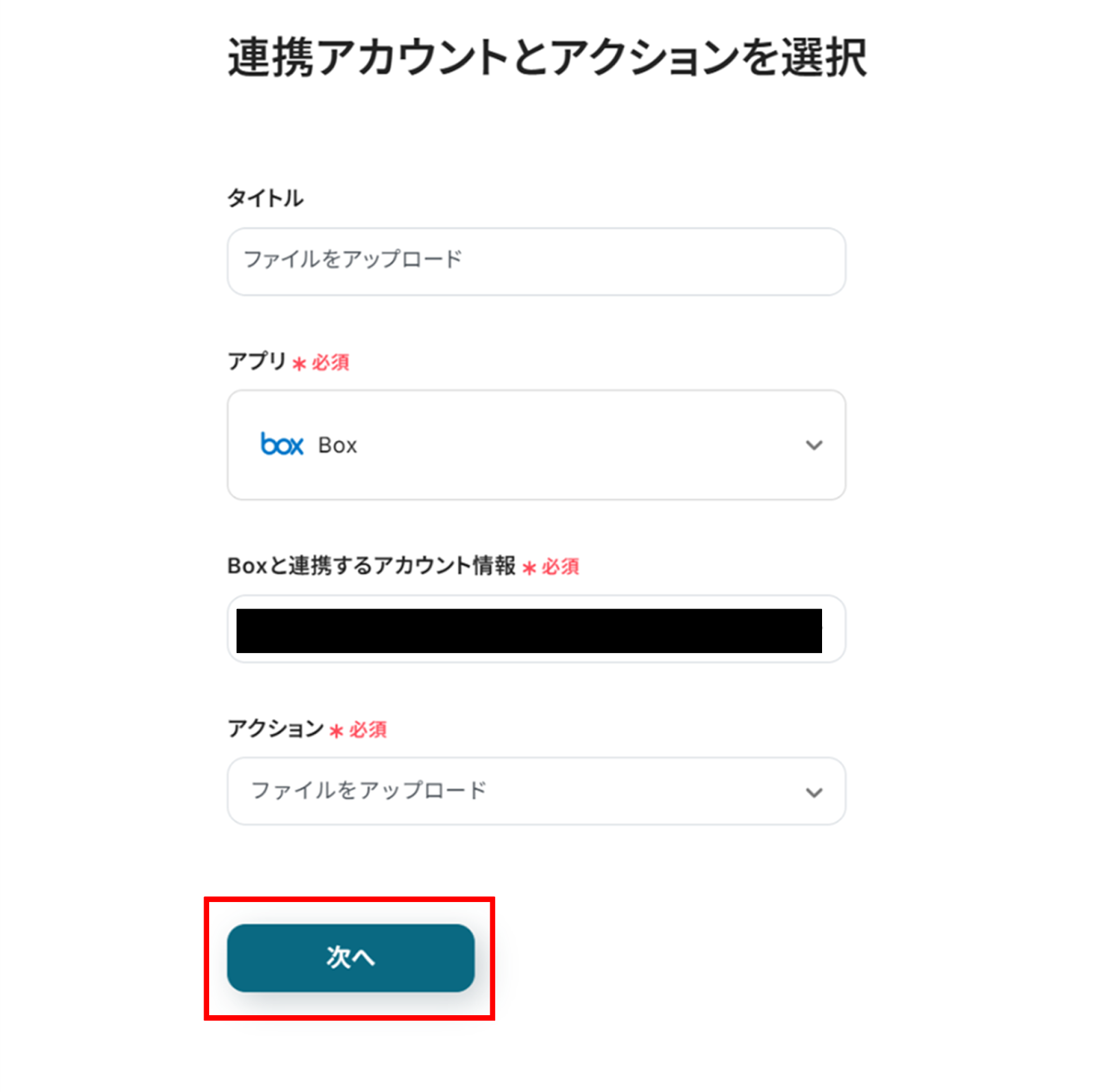 (2)Boxの「連携アカウントとアクションを選択」画面から、Boxと連携するアカウント情報に誤りがないかを確認し、「次へ」をクリックします。