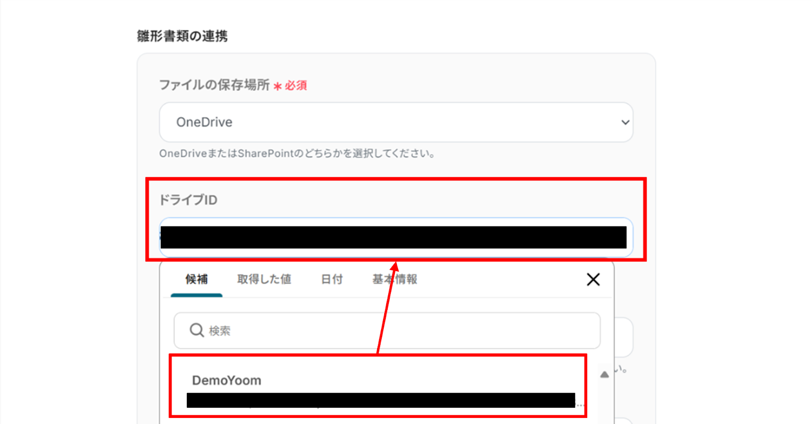 下へ進み、ファイルの保存場所、ドライブID、ファイル名(任意)、アイテムIDを入力します。ドライブID、アイテムID、シート名は下の画像のように候補から選択ができます。